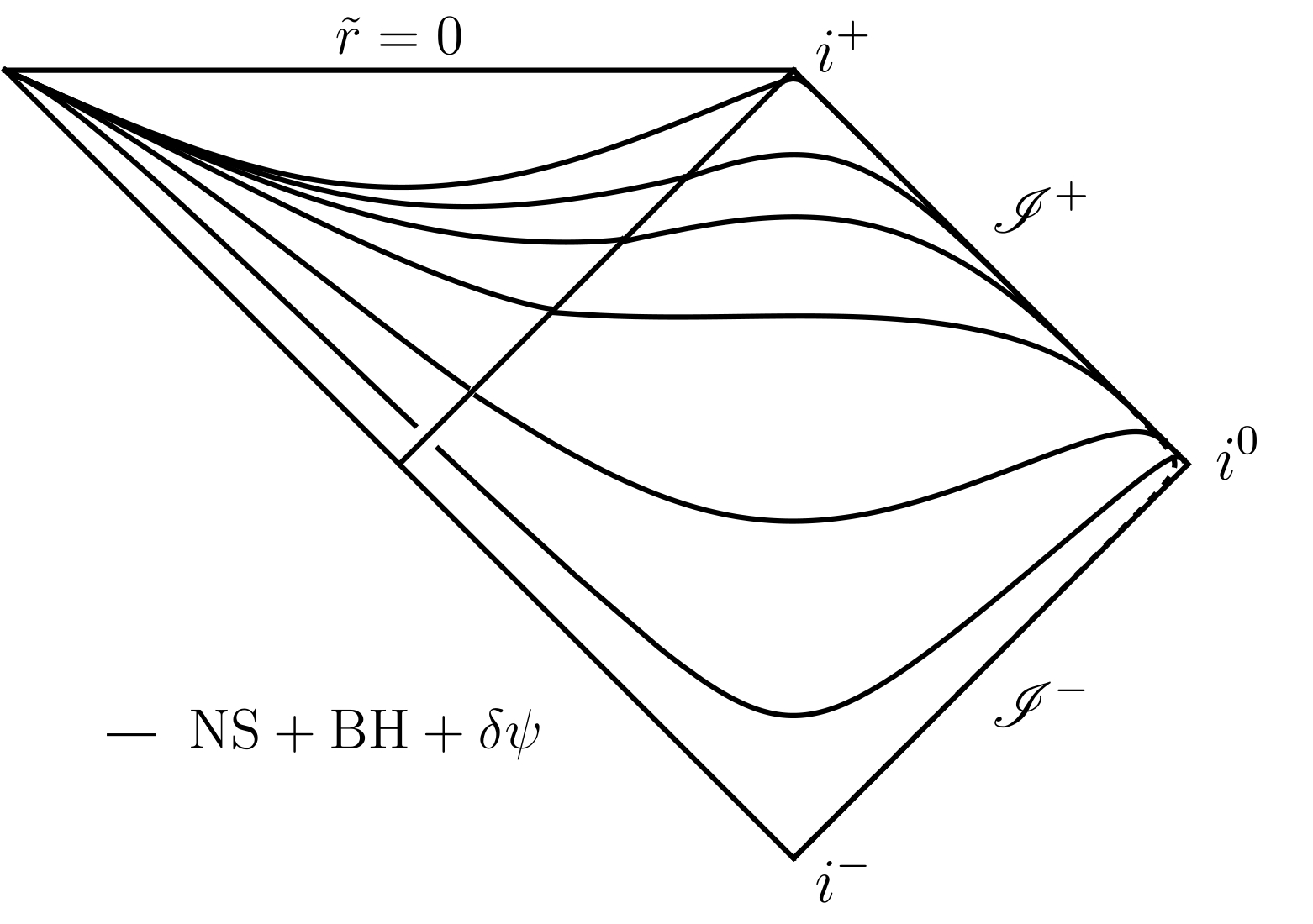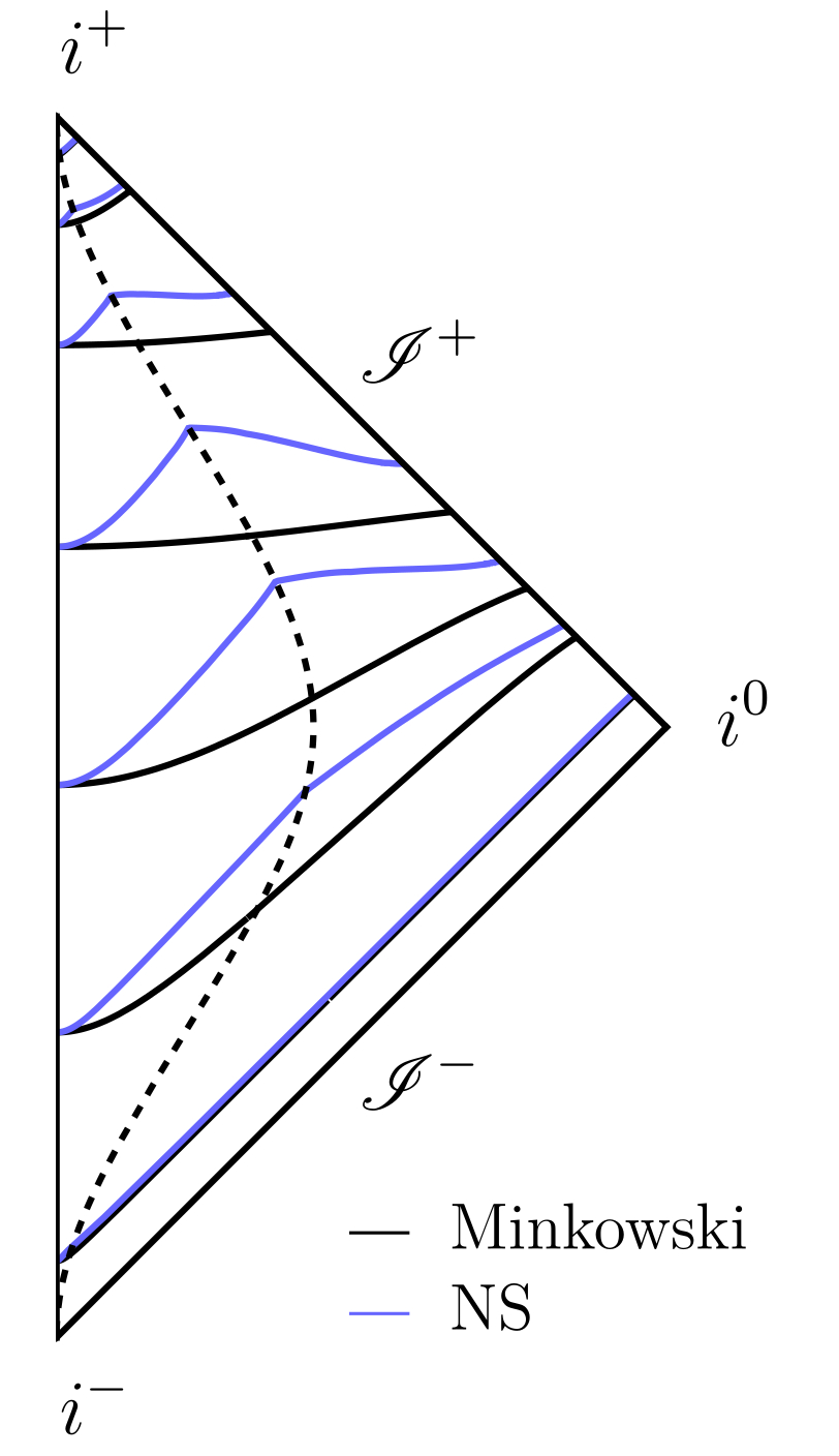 Hyperboloidal slices including neutron stars. On the left, slices of a single polytropic-like neutron star in blue (surface in dashed back) and comparison to Minkowski in black. On the right, a neutron star with black hole at its center.